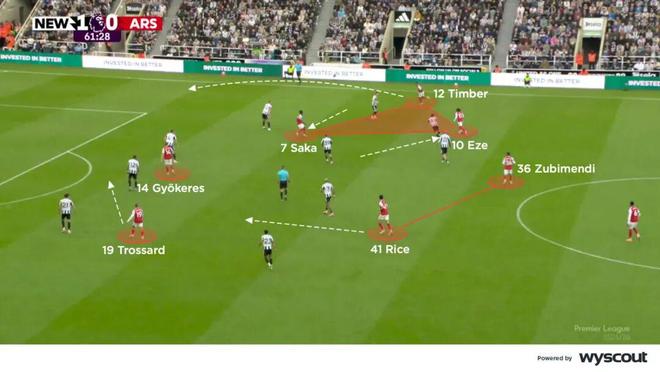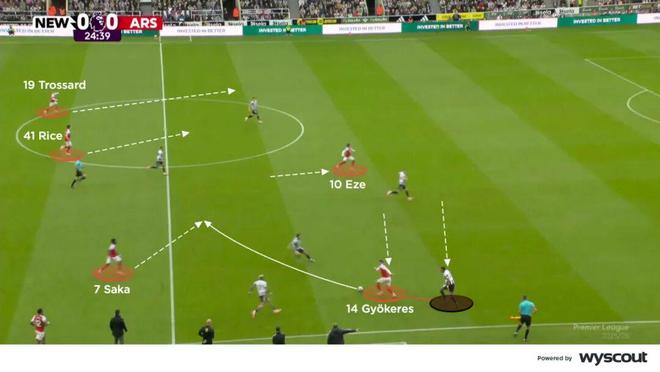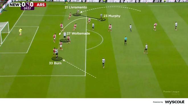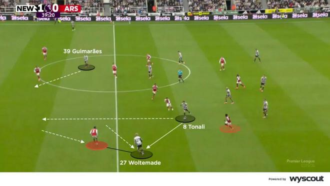纽卡斯尔同样会把阿森纳中卫牵扯离开位置,利用他们留下的空档。沃尔特马德更多在左路接应,他所利用的空间往往来自廷伯的前插。纽卡斯尔的中场进攻力量比阿森纳更强,他们的阵型让两名8号球员能够不断前插,与中锋形成配合。托纳利、乔林顿和吉马良斯都曾高位插上,填补沃尔特马德拉开的空档。不过,纽卡斯尔取得领先的进球最终来自一次角球的短传配合,沃尔特马德在禁区内完成终结。