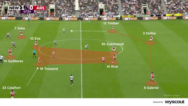 阿尔特塔与埃迪·豪的调整 半场时,阿尔特塔用萨利巴换下莫斯克拉,并微调了进攻体系。随着比赛进入下半场,纽卡斯尔摆出更加稳定的中场区域防守。对此,阿森纳在出球时常形成三后卫结构,卡拉菲奥里前插到左路并拉开宽度,特罗萨德内收,与埃泽一起站在双后腰身前。这样一来,阿森纳在中路的传递联系更紧密,有效对抗纽卡斯尔的窄中场。廷贝尔则在较深的位置,配合萨卡制造威胁。