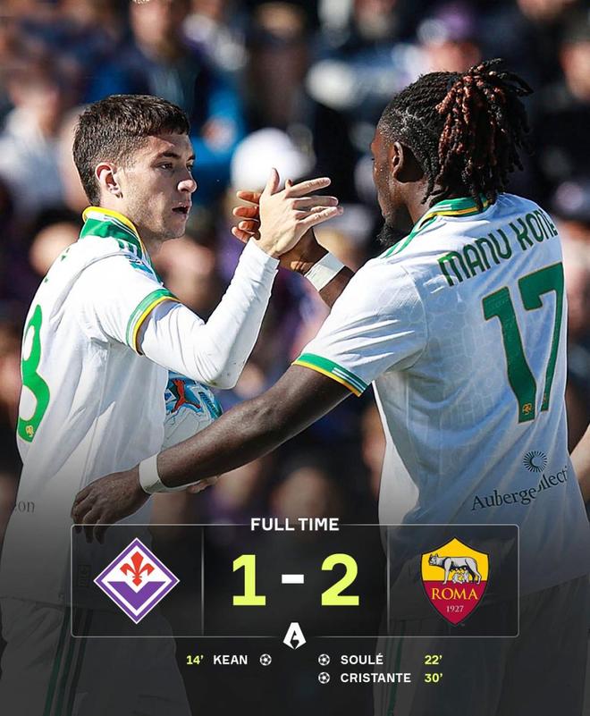 罗马2-1佛罗伦萨 红狼客场对阵佛罗伦萨,他们先丢一球,随后连扳2球笑到最后,比赛仅仅开打13分钟,佛罗伦萨前锋基恩轰出一脚世界波打破僵局,罗马0-1落后;仅仅过了7分钟,罗马便还以颜色,小将苏莱在禁区外一脚远射将比分扳成1-1平手;第29分钟,克里斯坦特在角球进攻中头槌建功,帮助罗马2-1反超对手;随后主队佛罗伦萨疯狂反扑,但是面对红狼钢铁般的防守却无可奈何,最终在主场1-2不敌对手,目送罗马豪取3连胜,积分上升到15分,与那不勒斯并列榜首。值得一提的是,加斯佩里尼的球队6轮仅丢2球,不仅是意甲丢球最少的球队,更是同一时期五大联赛最强钢铁防线。