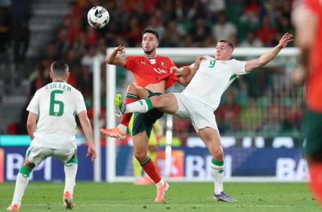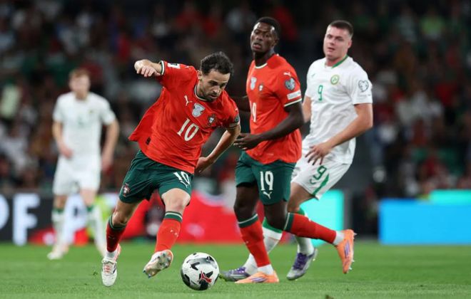 最新一期世界排名,葡萄牙高居第5位,爱尔兰位列第61位。两队在世预赛历史上有过4次碰面,葡萄牙队1胜3平保持不败。 本场比赛,葡萄牙队在首发上延续了主力阵容,C罗出任单箭头,内托、B费、B席位列身后,维蒂尼亚、内维斯组成双后腰,鲁本·迪亚斯、达洛特、伊纳西奥、努诺·门德斯领衔后卫线,-迪奥戈·科斯塔镇守球门。 尽管葡萄牙在实力上占据绝对优势,但主场面对爱尔兰却得势不得分,持续冲击后防线未果。 第17分钟,C罗外围远射击中了立柱弹出,随后B席跟进补射打偏了,错失绝佳良机。 第30分钟,内维斯传中到门前,防守球员抢先一步头球解围,C罗未能抢点攻门。第35分钟,内托突破后分球,B费直接怒射被封堵出来。第42分钟,葡萄牙角球机会,伊纳西奥前点甩头攻门被对方门将扑出。 上半场结束,比分还是0-0平。