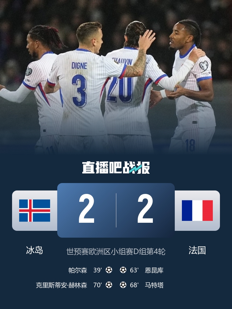 法国本轮世预赛2-2战平冰岛,本场恩昆库、马特塔进球。 两亿齐废?瑞典世预赛4轮不胜无缘直接晋级世界杯,近3轮0进球