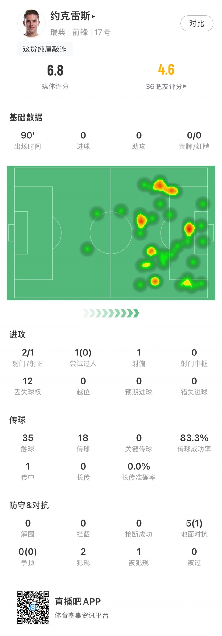 足球比分网10月14日讯 世预赛赛场,瑞典0-1不敌科索沃,瑞典无缘直接晋级世界杯。 本场约克雷斯、伊萨克均首发打满全场,伊萨克全场6射2正0球,1次错失良机。约克雷斯数据为2射1正0球。