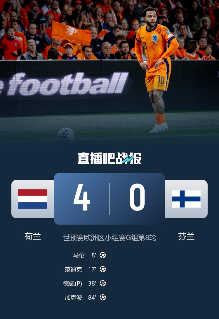 德佩点射+助攻双响,马伦世界波,范迪克、加克波建功;荷兰6轮不败领跑G组。 【其他新闻】 Here We Go!罗马诺:33岁前阿森纳中场威尔希尔出任卢顿主帅