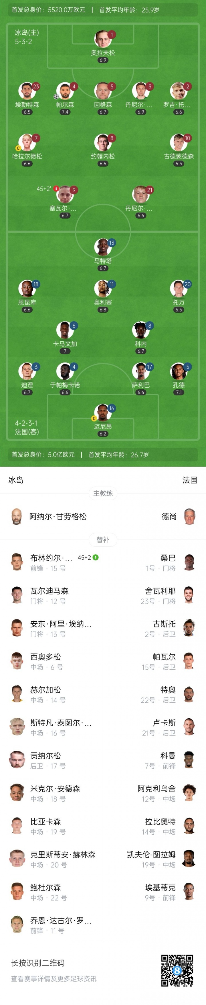 足球比分网10月14日讯 世预赛欧洲区小组赛D组第4轮,法国客战冰岛,赛前首发公布。 冰岛首发:1-奥拉夫松、23-埃勒特森、4-帕尔森、5-因格森、3-丹尼尔·利奥·格雷特森、2-罗吉·托马森、7-哈拉尔德松、8-约翰内松、10-古德蒙德森、9-塞瓦尔·阿特利·马格努森、21-丹尼尔·古德约恩森 冰岛替补:12-瓦尔迪马森、13-安东·阿里·埃纳尔斯、6-西奥多松、14-赫尔加松、16-斯特凡·泰图尔·索尔达森、17-贡纳尔松、18-米克尔·安德森、19-比亚卡森、20-克里斯蒂安·赫林森、22-鲍杜尔森、15-布林约尔·达里·威鲁姆松、11-乔恩·达吉尔·罗斯泰因松 法国首发:16-迈尼昂、5-孔德、4-于帕梅卡诺、17-萨利巴、3-迪涅、6-卡马文加、8-科内、11-奥利塞、20-托万、18-恩昆库、13-马特塔 法国替补:1-桑巴、23-舍瓦利耶、2-古斯托、15-帕瓦尔、22-特奥、21-卢卡斯、7-科曼、12-阿克利乌舍、14-拉比奥特、19-K-图拉姆、9-埃基蒂克 【本场比赛双方首发阵型图】
