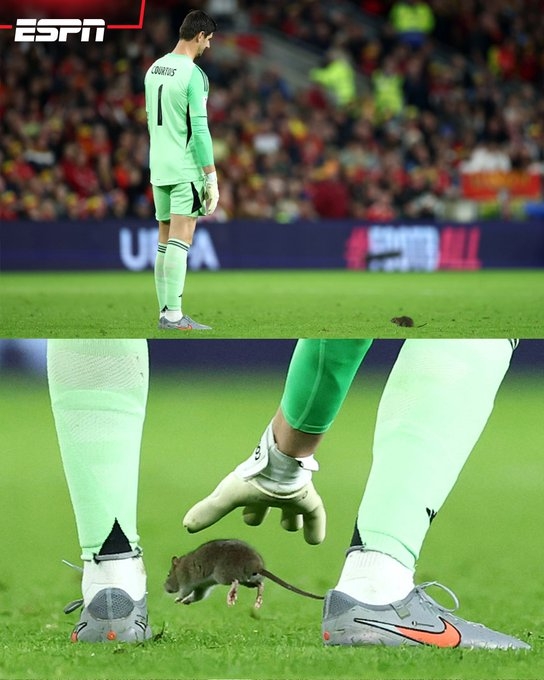 足球比分网10月14日讯 在今天凌晨进行的世界杯预选赛,比利时国门库尔图瓦试图在球场上抓住一只老鼠。 本场比赛比利时客场4-2战胜威尔士,比赛中一只老鼠闯进球场,库尔图瓦当时想要抓住老鼠。赛后库尔图瓦表示:“我看到那只老鼠出现,想要阻止它。球迷们都在欢呼加油,但我没有抓住。如果我真的抓到老鼠会怎么处理?我会把它放出场外,肯定不会伤害它。”