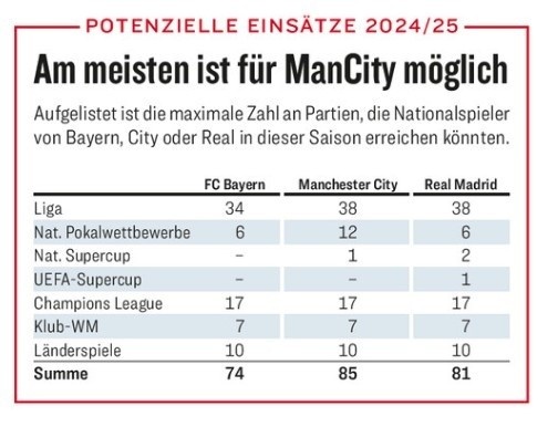 上赛季,曼城、皇马和拜仁都没有达到极限场次,但超负荷运转已经成为了豪门的日常。 过去的这一年,改制后的欧战和世俱杯接踵而至,很多球员都处于不得喘息的状态。上赛季在极端情况下,曼城球员需要踢85场比赛,皇马球员要踢81场,拜仁球员要踢74场比赛。不过,由于三支球队的杯赛(欧冠&世俱杯)行程结束较早,球员们不用受此煎熬。世俱杯半决赛开打之前,马雷斯卡曾抱怨“切尔西在过去354天踢了70场比赛”,令他始料未及的是,蓝军的对手弗鲁米嫩塞在大西洋的对岸同样踢了70场比赛。