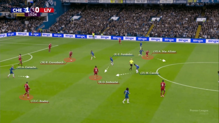每当利物浦阵型前压,亚当-沃顿就像影子一样贴着这位荷兰中场。三天后加拉塔萨雷在欧冠玩得更绝:他们故意放出传给赫拉芬贝赫的线路,同时封死所有短传点,就等他接球瞬间来个“瓮中捉鳖”。 来看这个镜头:京多安迂回跑位卡住阿利森回传范迪克的路线,奥斯梅恩往那一站,门将也不敢分球给科纳特或索博斯洛伊。表面看赫拉芬贝赫无人看管,可球刚到他脚下,托雷拉就扑上来断球,最终皮球落到奥斯梅恩脚下: 这次进攻以赫拉芬贝赫在禁区外拉倒对方前锋染黄收场。到了切尔西这场,蓝军直接祭出人盯人绝活:恩佐-费尔南德斯和古斯托像牛皮糖一样粘着赫拉芬贝赫和麦卡利斯特,中场的轻松接球路线被彻底切断。 当赫拉芬贝赫在后场接球时(如下图),他出球慢的半拍迟疑,立马被蓝军抓住机会封死所有出球点。更糟的是,由于索博斯洛伊回撤稍慢,麦卡利斯特也没能及时前插策应: