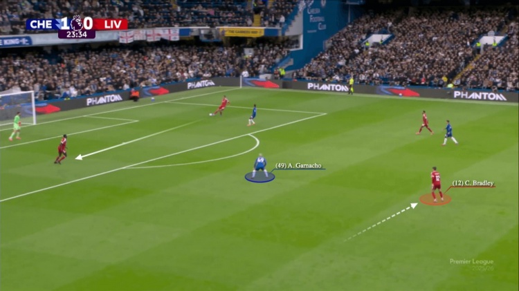 赫拉芬贝赫最终只能勉强长传找萨拉赫,结果自然是无功而返。几分钟后,布拉德利曾让人看到重现上赛季战术的曙光:他先内收中场带走加纳乔的防守注意力……