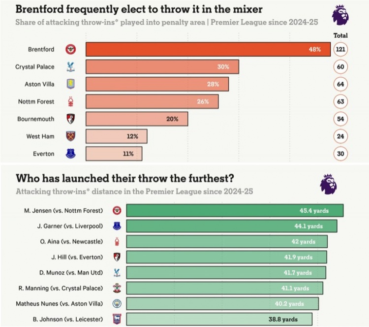 伯恩茅斯是英超最擅长使用“手榴弹”战术的球队之一。 除了精研压迫式反抢打法,伊劳拉也非常注意追随潮流,他认为只有在战术层面上精益求精,才能从竞争激烈的英超赛场脱颖而出。无论是来自门将的后场大脚长传,还是两个半场开始时直接将球踢出界然后再实施压迫,亦或是频繁砸向禁区的“手榴弹”式边线球,伯恩茅斯运用地都非常娴熟,他们是英超为数不多集齐了所有潮流战术元素,还可以坚定不移地贯彻到底的球队之一,伊劳拉对麾下的掌控力可见一斑。