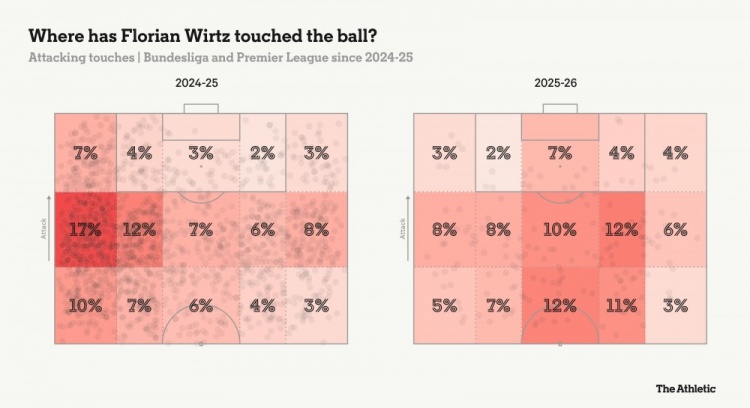 当然,维尔茨状态不佳,也不是利物浦没达到最佳水平的唯一原因。他们的进攻流畅度不够:萨拉赫和加克波都远不在最佳状态,而从纽卡斯尔转投而来的伊萨克因为错过了全部季前赛,现在还在恢复比赛体能。 在这位德国球员身后,赫拉芬贝赫踢得还行,可他的中场搭档麦卡利斯特就显得有点吃力。这位阿根廷国脚可以说是利物浦中场最重要的球员,因为节奏都由他掌控,可自从四月份以来,他还没为俱乐部踢满过90分钟,状态也一直不稳。 维尔茨是个喜欢跑动的球员。 他不停地移动、找空间。但在离开勒沃库森后的这个赛季初调整期,部分适应问题也在于:他的新队友们,同样需要时间去适应他的比赛风格。 比如下面这个例子,来自周六比赛下半场刚开始——这本是利物浦希望他能跑进去的位置…… ……但有好几次,球明明可以传到类似区域,却最终没有传过去。 他每90分钟的触球次数,虽然目前样本还小,但比起他23/24赛季在勒沃库森时的总数,已经明显下降了。 这到底是队友没主动找他,还是因为他一米七六的瘦小身材让队友担心容易丢球?还真不好说。 维尔茨这赛季到目前为止的触球点,分布在球场各个区域,远比你对一个单前腰所预期的要分散,而且和他在勒沃库森时习惯活动的区域明显不一样。 就像前面数据图显示的,他的机会创造几乎全来自利物浦的左路。