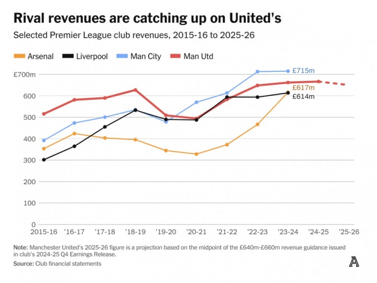 虽然曼联上赛季收入创历史新高,却仍连续第六年亏损。拉特克利夫推行成本削减,但巨额转会支出与持续债务压力并存,复兴之路挑战重重。The Athletic作者Mark Critchley与Chris Weatherspoon就进行了详细分析。 尽管上赛季无缘欧冠,曼联依然创下俱乐部历史收入新高,但与此同时,他们也连续第六年未能实现盈利,暴露出竞技表现与财务健康之间的持续背离。 最新发布的24/25财年财报显示,曼联总营收达到6.665亿英镑,主要得益于比赛日收入和商业收入的大幅提升。其中,比赛日收入创下英格兰球队新高的1.603亿英镑,商业收入也增长至3.333亿英镑,成功缓冲了因缺席欧冠而导致的转播收入下降。 尽管如此,俱乐部该财年仍录得3300万英镑亏损。虽然较上一财年1.132亿英镑的赤字有所收窄,但这已是曼联连续第六年处于亏损状态。 更值得警惕的是,尽管上赛季收入打破纪录,曼联在公告中预计本赛季收入将出现下滑,25/26财年收入预计介于6.4亿至6.6亿英镑之间。这将是俱乐部十余年来首次无缘欧战,而预期中的收入降幅甚至低于参加欧联杯可能带来的收入,说明俱乐部已将其它业务增长纳入测算依据。