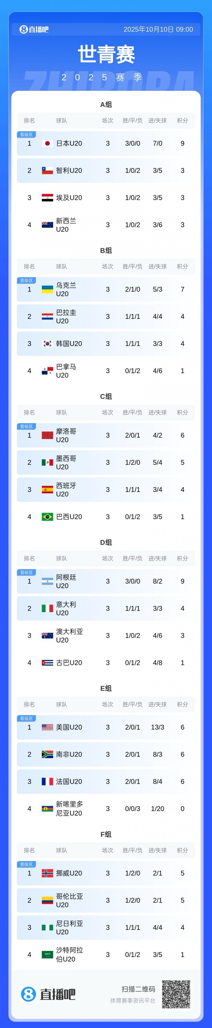足球比分网10月10日讯 世青赛16强赛,韩国1-2遭摩洛哥淘汰。亚洲球队本届世青赛全军覆没。 本届世青赛日本、韩国、澳大利亚、沙特四队进入到正赛阶段。 成绩如下: 沙特小组赛3场1平2负,进3球丢5球,拿1分排在小组垫底。 澳大利亚小组赛3场1胜2负,进4球丢6球拿到3分排在小组第三,但最终无缘4个成绩最好的小组第三出局。 日本小组赛3场全胜晋级16强,进7球无失球。16强赛加时赛遭法国绝杀,惨遭淘汰。 韩国小组赛3场1胜1平1负,进3球丢3球,拿到4分,最终排在4个成绩最好的小组第三之内晋级16强。16强赛1-2不敌摩洛哥遭淘汰。