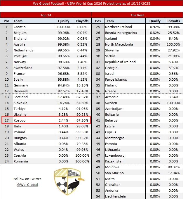 科索沃上个月世界排名是第95位,比国足还低1位,2-0击败瑞典后升至第91位,现比国足高3位。 据We Global Football预测,科索沃小组第一直通世界杯的概率仅2.44%,但进入欧洲区附加赛的概率高达67.2%。
