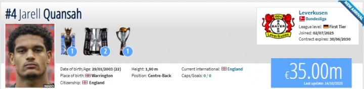 足球比分网10月14日讯 德转更新了德甲新一期身价排行,效力勒沃库森的宽萨身价从2000万欧大涨至3500万欧。 今年夏天,勒沃库森以3500万欧的价格从利物浦引进22岁英格兰中卫宽萨。至今为勒沃库森场场打满,贡献1个进球,现已是药厂不可或缺的核心球员。