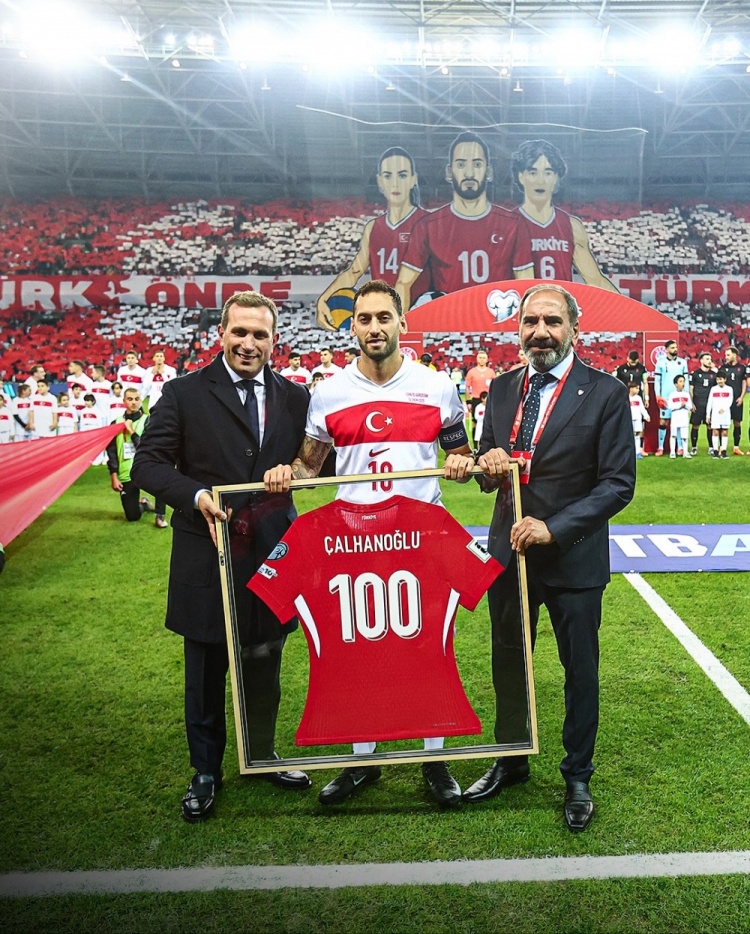 已是传奇!恰尔汗奥卢赛前获赠国家队百场纪念