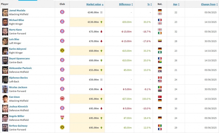 足球比分网10月14日讯 德转更新德甲身价,奥利塞身价暴涨3000万欧元,从1亿跃升至1.3亿欧,穆西亚拉1.4亿不变。 德甲前十身价 1-穆西亚拉,1.4亿 2-奥利塞,1.3亿,+3000万 3-凯恩,7500万 4-路易斯-迪亚斯,7000万 5-阿德耶米,6000万,+1500万 5-于帕梅卡诺,6000万,+1000万 7-帕夫洛维奇,5500万 8-戴维斯,5000万 8-杰克逊,5000万 10-乌尊,4500万,+2700万 10-基米希,4500万 10-斯蒂勒,4500万 10-吉拉西,4500万