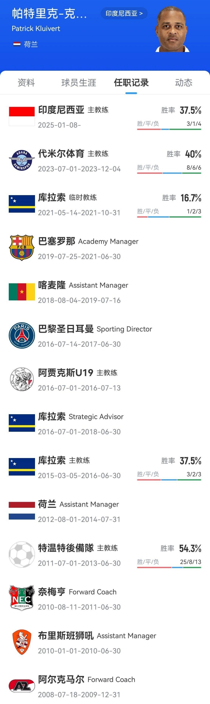 足球比分网10月16日讯 印度尼西亚国家队官方消息,球队主帅克鲁伊维特下课,执教仅9个月。 印尼公告: 经过近12个月的紧密合作,印尼足协向帕特里克·克鲁伊维特教练及其团队致以最高敬意,感谢他们为印尼足球事业所作出的奉献与贡献。 在经过坦诚且相互尊重的讨论后,双方共同决定终止此次合作。我们衷心感谢帕特里克·克鲁伊维特教练及其团队展现的承诺精神与职业素养。 他们为印尼足球注入的激情与奉献精神将永远被铭记,我们衷心祝愿他们在未来征程中一切顺利。 克鲁伊维特今年1月8日出任印尼国家队主帅,合同期为2025年-2027年,附带延长合同选项。克鲁伊维特上任后,印尼18强赛2胜2负,以小组第四进入世亚预第四阶段,第四阶段2场皆负无缘世界杯。克鲁伊维特仅上任9个月,一共执教8场比赛,取得3胜1平4负。 克鲁伊维特现年49岁,球员时代他是足坛最优秀的射手之一,曾效力阿贾克斯、AC米兰、巴萨等队,退役后曾担任喀麦隆助教、库拉索代理主帅。他执教印尼前唯一一段正式主帅经历是2023年7月起担任土超代米尔体育主帅,20场比赛8胜6平6负,执教5个月便下课。克鲁伊维特还担任过荷兰国家队主帅范加尔的助教,帮助球队在2014年巴西世界杯获得季军。