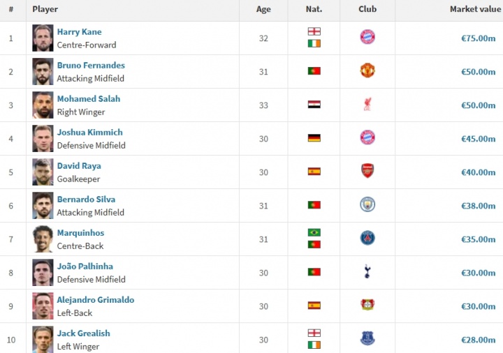 30岁以上球员身价榜:32岁凯恩7500万欧居首 B费萨