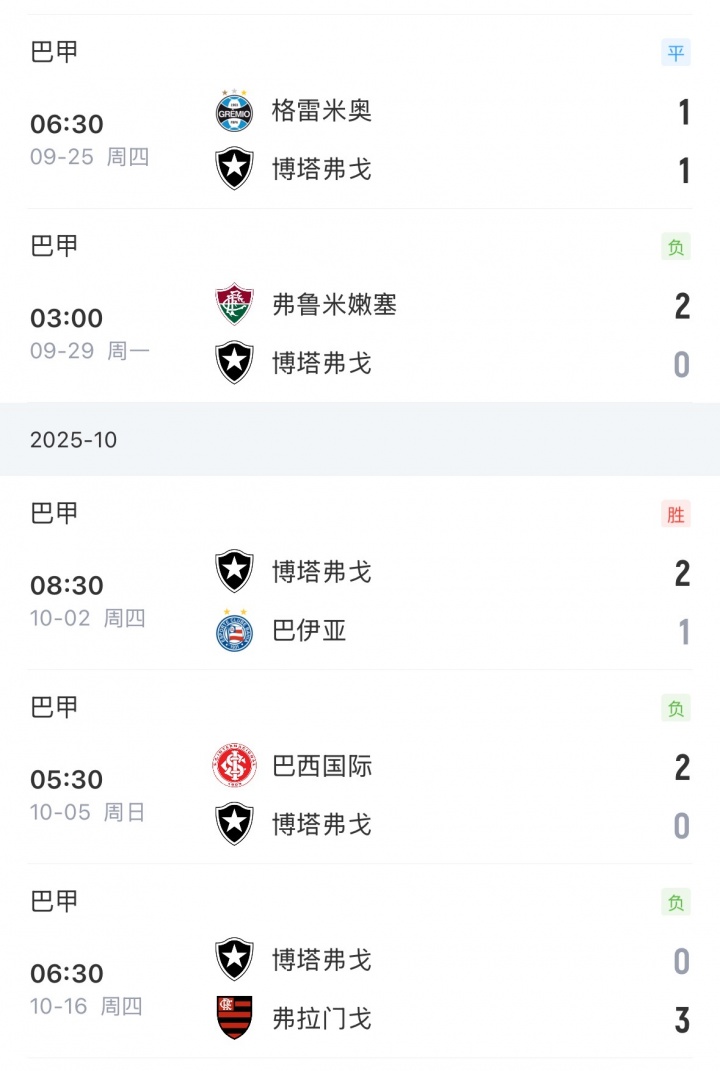 足球比分网10月16日讯 据西媒塞尔电台报道,安切洛蒂儿子大卫-安切洛蒂目前执教博塔弗戈遭遇战绩滑铁卢,近5场仅取得1场胜利。 报道称,小安切洛蒂曾是父亲的得力助手,陪伴后者度过皇马最辉煌的时期之一,两人共同斩获西甲、欧冠等多项冠军。当这位安切洛蒂决定接受执教巴西国家队的挑战时,大卫在博塔弗戈找到了机会 ,既能与父亲保持近距离,又能在熟悉的 “家庭氛围” 中继续积累执教经验。 然而,现实与憧憬相去甚远。球队在近五场联赛中仅取得一场胜利,还在主场0-3不敌弗拉门戈,这也意味着球队已经基本失去夺冠可能,目前球队距榜首已有18分差距,排名跌至第五位。 博塔弗戈于今年7月8日官宣小安切洛蒂出任球队主帅,带队至今,博塔弗戈22场10胜5平7负,胜率45.5%。 博塔弗戈近期战绩↓