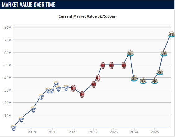 足球比分网10月17日讯 今日德转更新英超球员身价,两名前米兰中场托纳利和赖因德斯身价均迎来上涨。 现效力纽卡的托纳利身价上涨1500万至7500万欧,成为意大利身价第二高的球员,仅次于8000万欧的巴斯托尼。 托纳利身价曲线↓