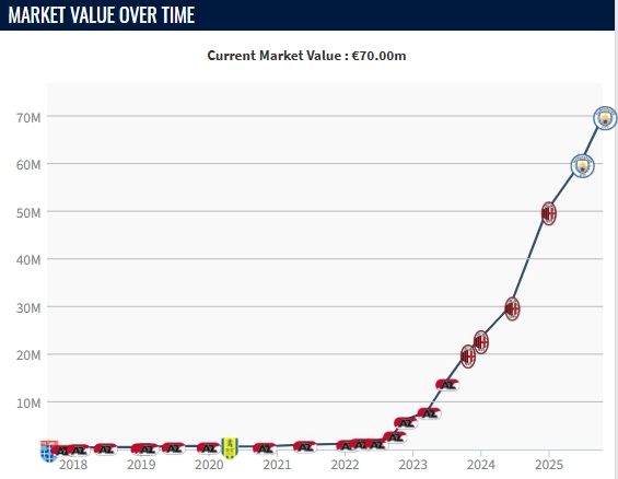 今夏以5500万欧转会费加盟曼城的赖因德斯,身价上涨1000万至7000万欧。 赖因德斯身价曲线↓