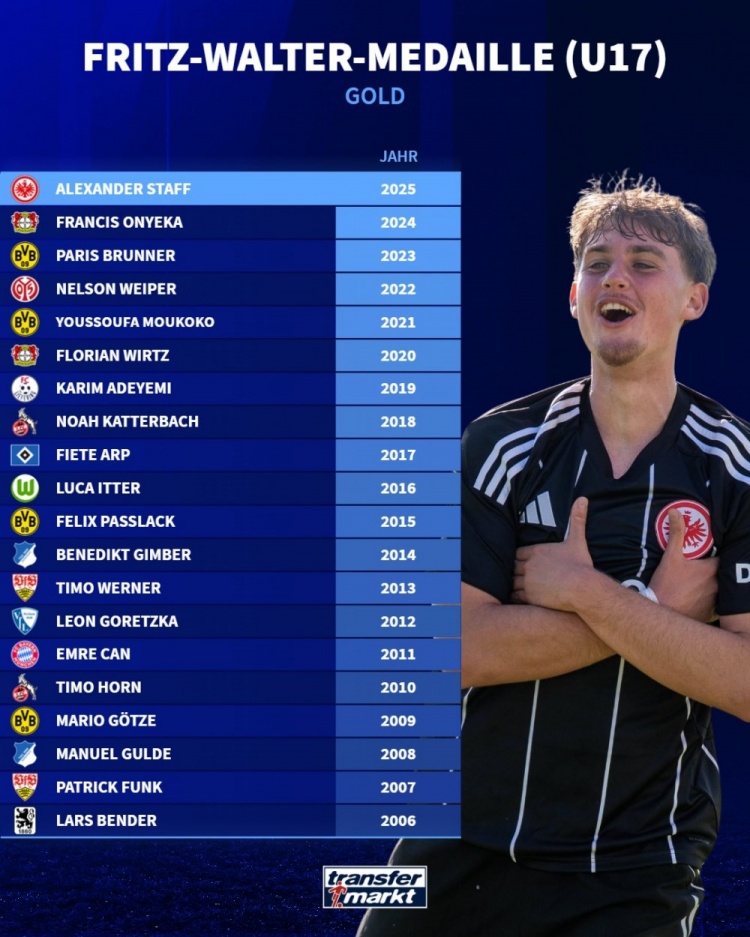 足球比分网10月17日讯 法兰克福前锋斯塔夫当选德国U17年度最佳新秀,德国转会市场列出了历届德国U17年度最佳新秀名单。 历届德国U17年度最佳新秀: 斯塔夫——2025 奥涅卡——2024 帕里斯-布鲁纳——2023 韦佩尔——2022 穆科科——2021 维尔茨——2020 阿德耶米——2019 卡特巴赫——2018 阿尔普——2017 卢卡-伊特——2016 帕斯拉克——2015 金贝尔——2014 维尔纳——2013 格雷茨卡——2012 埃姆雷-詹——2011 蒂莫-霍恩——2010 格策——2009 古尔德——2008 帕特里克-芬克——2007 拉斯-本德——2006 |