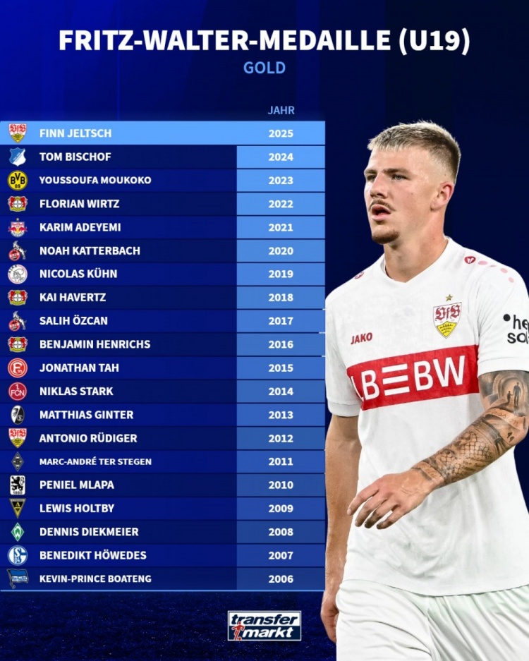 足球比分网10月17日讯 斯图加特中卫耶尔奇当选德国足协年度U19最佳新秀,德国转会市场列出了历届德国U19年度最佳新秀的名单。 历届德国U19年度最佳新秀: 耶尔奇——2025 比朔夫——2024 穆科科——2023 维尔茨——2022 阿德耶米——2021 卡特巴赫——2020 尼古拉斯-屈恩——2019 哈弗茨——2018 厄兹詹——2017 亨里希斯——2016 若纳坦-塔——2015 尼克拉斯-斯塔克——2014 马蒂亚斯-金特尔——2013 吕迪格——2012 特尔施特根——2011 姆拉帕——2010 霍尔特比——2009 迪克迈尔——2008 霍韦德斯——2007 凯文-博阿滕——2006 |