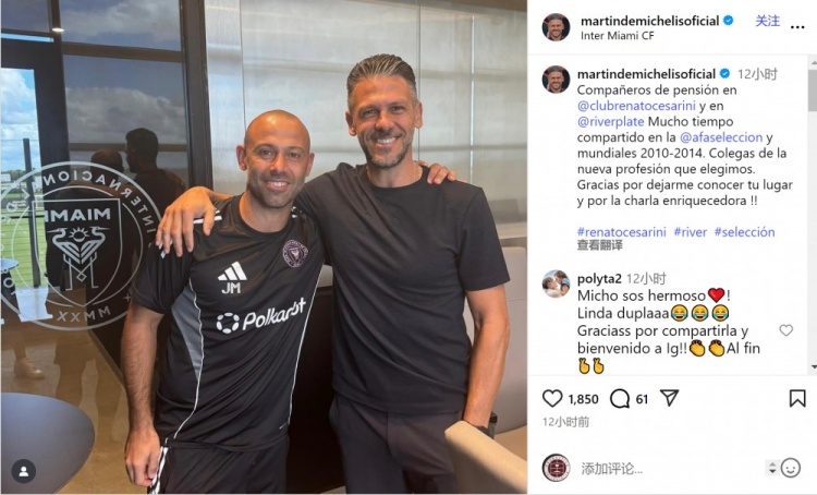 足球比分网10月17日讯 前阿根廷国脚德米凯利斯更新社媒动态,晒出与马斯切拉诺的合照。 德米凯利斯造访迈阿密国际俱乐部,并与迈阿密国际主帅、昔日队友马斯切拉诺合影,他在社交媒体上晒出合照,配文:“我在切萨里尼(河床青训)和河床的室友,我们不仅在2010年、2014年世界杯上为阿根廷并肩作战,如今更成为教练同行。感谢你让我领略你现在的天地,这次交流令我受益良多。” 德米凯利斯曾担任河床、蒙特雷主帅,目前赋闲在家。 |