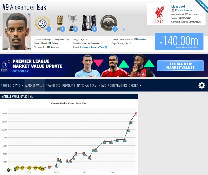 伊萨克身价涨至1.4亿欧!德转解释:创纪录转会