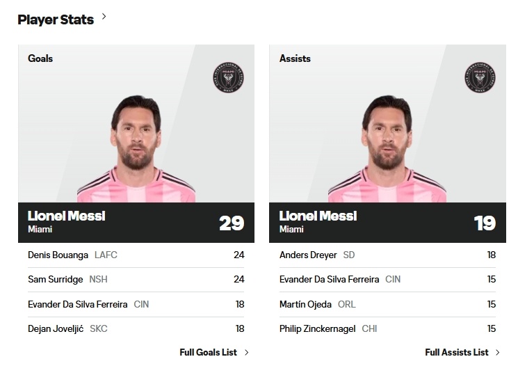 足球比分网10月19日讯 2025赛季美职联常规赛全部结束,梅西收官战3射1传,率领迈阿密5-2击败纳什维尔。梅西常规赛28场29球19助,射手榜、助攻榜双双霸榜! 美职联常规赛射手榜前三 梅西(迈阿密国际)29球 博安加(洛杉矶FC)24球 苏里奇(纳什维尔)24球 美职联官方统计助攻榜方面,梅西19助,与圣地亚哥球员德雷尔持平,并列第一。