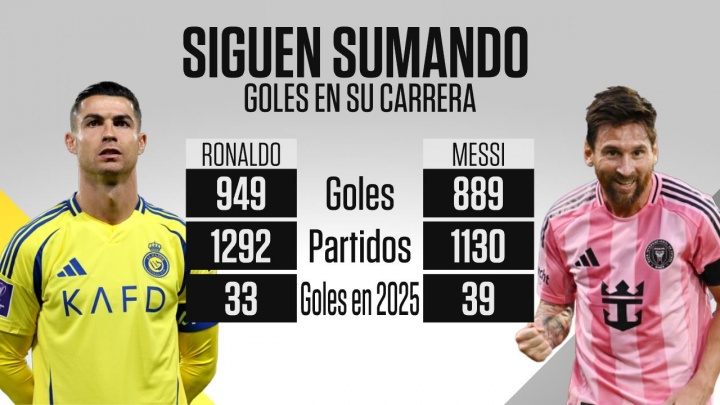 足球比分网10月19日讯 今日梅罗双双进球。梅西3射1传,帮助迈阿密国际在美职联5-2击败纳什维尔,而C罗传射建功帮助利雅得胜利5-1大胜哈萨征服。 C罗生涯1292场949球,梅西1130场889球。2025年梅西打入39球,C罗33球。