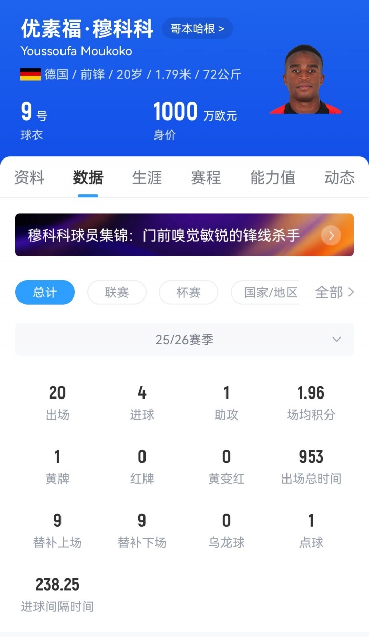 足球比分网10月21日讯 近日穆科科接受踢球者的采访,谈到了自己从多特转会到哥本哈根的经历,20场4球的开局对他来说并不是一个好的开始。 5年前16岁的穆科科进入了球迷的视野,当时他跳级参加梯队比赛依然大杀四方。2020/21赛季穆科科首次进入多特一线队,但自那之后,穆科科就再也没有展现出天才属性,他在多特各项赛事出战99场,贡献18球8助攻。 2024年夏天,穆科科被外租至法甲尼斯,在尼斯穆科科表现挣扎,仅出战22场比赛送出2球3助攻,在下半赛季被彻底弃用。而去年底《图片报》曝出穆科科将年龄改小的事件,虽然此事最终没有定论。 今年夏窗,多特蒙德以500万欧的转会费将穆科科卖给了丹麦豪门哥本哈根,截至目前穆科科代表球队出战20场,贡献4球1助攻,但在最近4轮联赛中,穆科科均只替补出战了不到20分钟,并遭遇联赛5场进球荒。 按照官方信息,穆科科下个月就将年满21岁,他目前的德转身价为1000万欧。