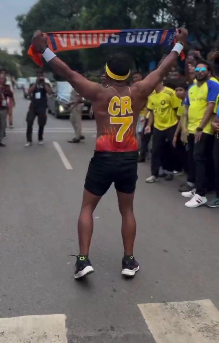 足球比分网10月22日讯 北京时间今天晚上21点45分,利雅得胜利将在亚冠二级小组赛中客场对阵印度球队果阿。 尽管C罗没有随利雅得胜利来到客场,但印度球迷对这场比赛仍然充满热情,有印度球迷在街头模仿C罗的标志性庆祝SIU,他的胸前写有“果阿”,背后则是彩绘的“CR7”字样。
