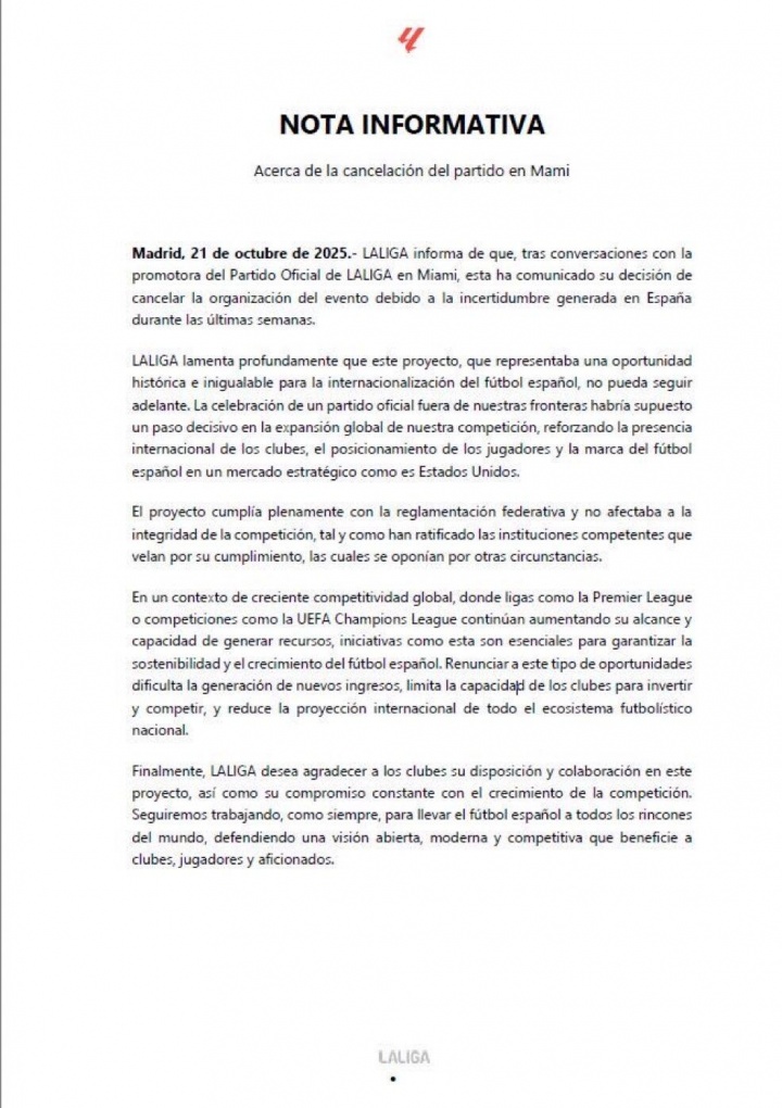 西甲联盟发布声明称,经与迈阿密官方联赛赛事主办方磋商,鉴于西班牙过去数周内产生的不确定性,主办方已决定取消本次赛事组织。 西甲联盟对此深表遗憾,这一项目本是西班牙足球国际化进程中史无前例的重要机遇。在海外举办官方联赛本将是我们赛事全球扩张的决定性一步,能有效强化俱乐部国际影响力、提升球员知名度,并在美国这一战略市场巩固西班牙足球品牌地位。 该项目完全符合足协规章制度,且经监管机构确认不影响赛事完整性。当前阻碍仅源于其他特殊情况下的反对意见。 在全球竞争日益激烈的背景下,面对英超联赛、欧冠赛事持续扩大影响力和创收能力的现状,此类创新举措对保障西班牙足球的可持续发展至关重要。放弃此类机遇将阻碍新收入来源的开拓,限制俱乐部的投资与竞争力,并削弱整个国家足球生态系统的国际影响力。 最后,西甲联盟对各俱乐部在此项目中的积极配合以及始终致力于赛事发展的承诺表示感谢。我们将继续坚持开放、现代与竞争性的理念,努力将西班牙足球推向世界每个角落,为俱乐部、球员和球迷创造更多价值。 西甲此前官宣巴萨客战比利亚雷亚尔将在迈阿密举行,但此举遭到西甲各队球员和球员工会的反对,西甲各队本轮联赛还举行抗议活动。科贝电台表示,西甲迈阿密海外赛取消后,比利亚雷亚尔对阵巴萨将在情歌球场举行。 |