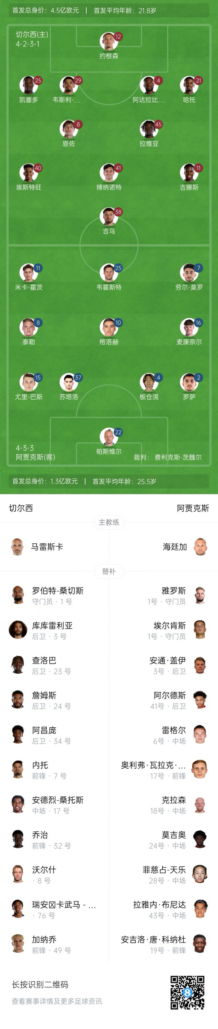 轮换!切尔西vs阿贾克斯首发:吉乌、吉腾斯、埃