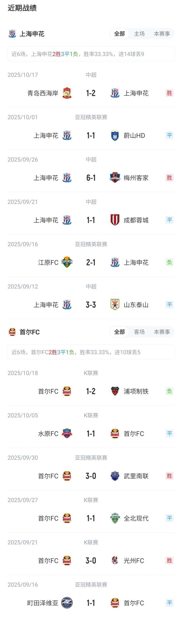 【近期战绩及交锋历史】 目前亚冠精英联赛东亚区积分榜上,申花1平1负积1分,位列第11;首尔1胜1平积4分,位列第4。双方此前从未有过交手。