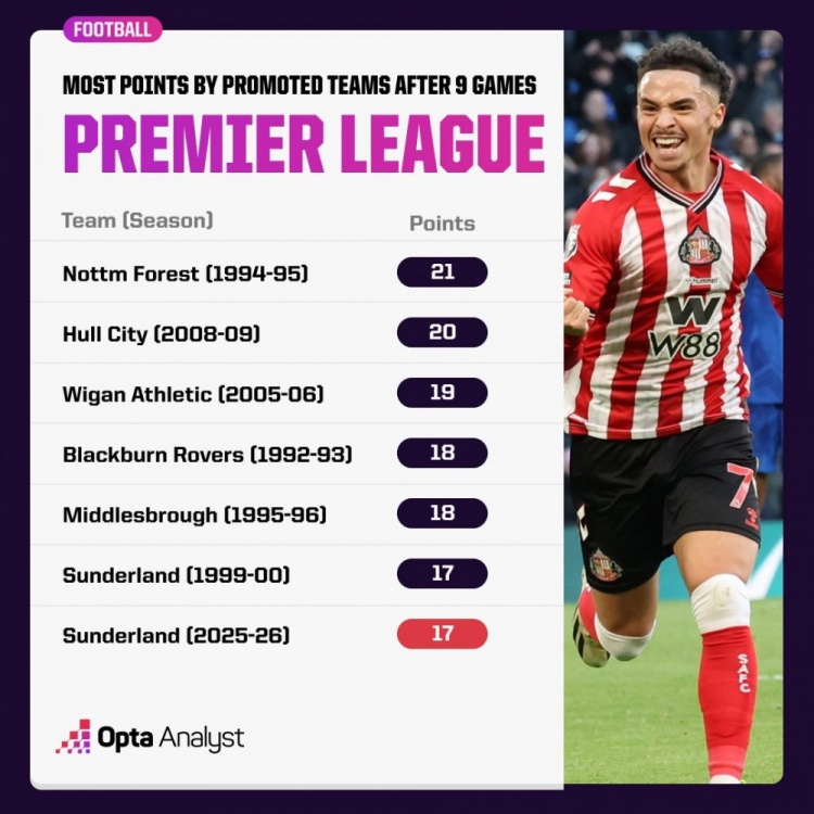 本赛季,情况似乎并未改观。与利兹联、伯恩利一路顺畅的升级之路不同,桑德兰上赛季在英冠(二级赛事)仅积 76 分,比两队少 24 分(两队均为 100 分),差距十分明显;两轮附加赛更是凭借补时破门才 “侥幸” 升级。因此,多数人并不看好这支球队 —— 尽管他们有老牌球会的底蕴,但时过境迁,谁还会纠结那些 “老故事” 呢? 不过,俱乐部高层的一系列运作以及球队上下一心的努力,推翻了人们的刻板印象。9 轮战罢,在阿森纳稳居榜首、曼市双雄回归正轨、红蓝双军虽有起伏但积分稳固的情况下,桑德兰与他们处在同一梯队,5 胜 2 平 2 负积 17 分的成绩,绝非 “昙花一现” 所能概括。