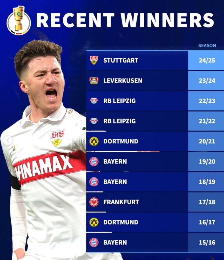 足球比分网10月29日讯 《转会市场》统计了近10年德国杯冠军,拜仁3次居首但已5年未能夺冠,多特、莱比锡各2冠。 德转列近10年德国杯冠军: 斯图加特,2024-25赛季 勒沃库森,2023-24赛季 莱比锡,2022-23赛季 莱比锡,2021-22赛季 多特蒙德,2020-21赛季 拜仁慕尼黑,2019-20赛季 拜仁慕尼黑,2018-19赛季 法兰克福,2017-18赛季 多特蒙德,2016-17赛季 拜仁慕尼黑,2015-16赛季 |