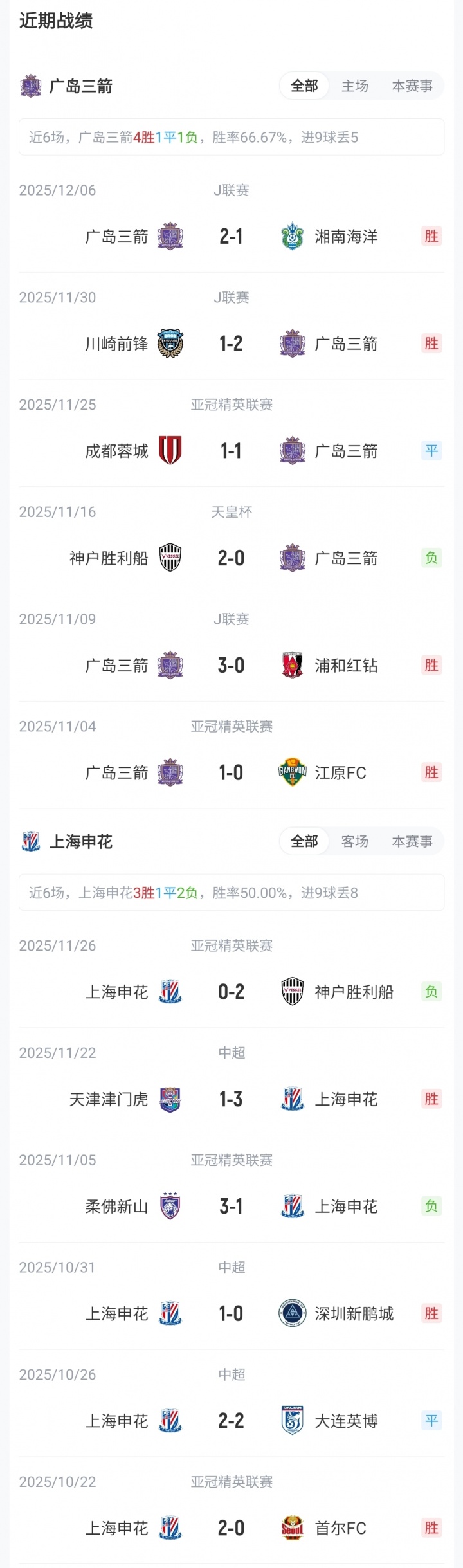 【近期战绩及交锋历史】 目前亚冠精英联赛东亚区积分榜上,上海申花1胜1平3负积4分,位列第11;广岛三箭2胜2平1负积8分,位列第5。