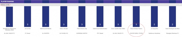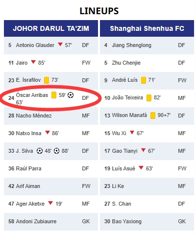 足球比分网12月09日讯 亚冠精英联赛第6轮,上海海港客场对阵柔佛新山。柔佛新山的24号球员奥斯卡·阿里巴斯在亚足联官网上的数据显示上一轮比赛吃到第三张黄牌,按规则应该停赛,但他本场依然首发。 亚足联官网显示,阿里巴分别在对阵武里南联、上海申花和墨尔本城时吃到黄牌,亚足联官网也显示他已经吃到了三张黄牌。