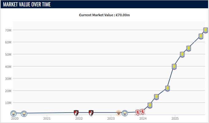 八连涨⏫23岁罗杰斯身价涨至7000万欧,维拉前场