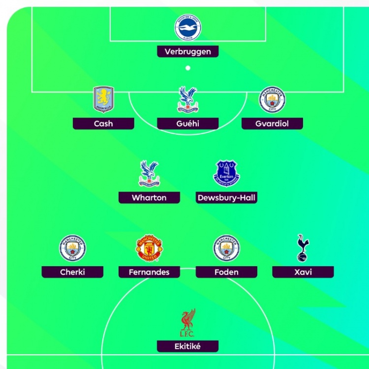 足球比分网12月10日讯 英超第15轮战罢,阿兰·希勒评本轮联赛最佳阵,埃基蒂克、谢尔基、B费、福登在列。 希勒评英超第15轮最佳阵: 门将:维尔布鲁根(布莱顿) 后卫:卡什(阿斯顿维拉)、格伊(水晶宫)、格瓦迪奥尔(曼城) 中场:亚当·沃顿(水晶宫)、霍尔(埃弗顿)、谢尔基(曼城)、B费(曼联)、福登(曼城)、哈维·西蒙斯(热刺) 前锋:埃基蒂克(利物浦) 主教练:埃梅里(阿斯顿维拉)