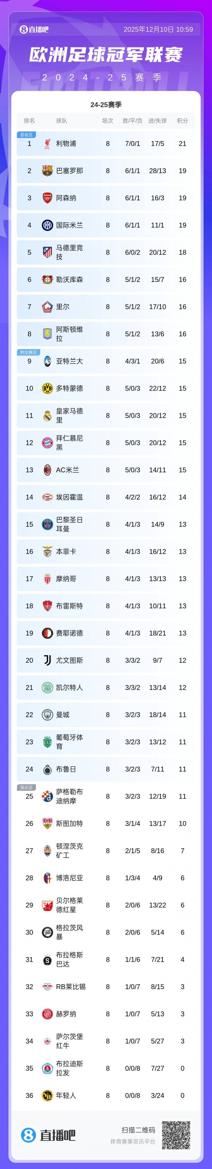 足球比分网12月10日讯 欧冠第6轮比赛日结束第一天的对决,国外的知名足球博主Football Rankings表示,欧冠拿到10分已经足够排名前24,所以10分及以上的14支球队基本已晋级欧冠附加赛。 分别是:阿森纳、拜仁、亚特兰大、巴黎、国米、皇马、马竞、利物浦、热刺、多特、切尔西、曼城、葡体、巴萨。该媒体还表示,阿森纳和拜仁已经锁定前20名。 作为参考,去年欧冠的直通分为16分及以上,附加赛分为11分及以上。 当前赛季欧冠实时积分榜: