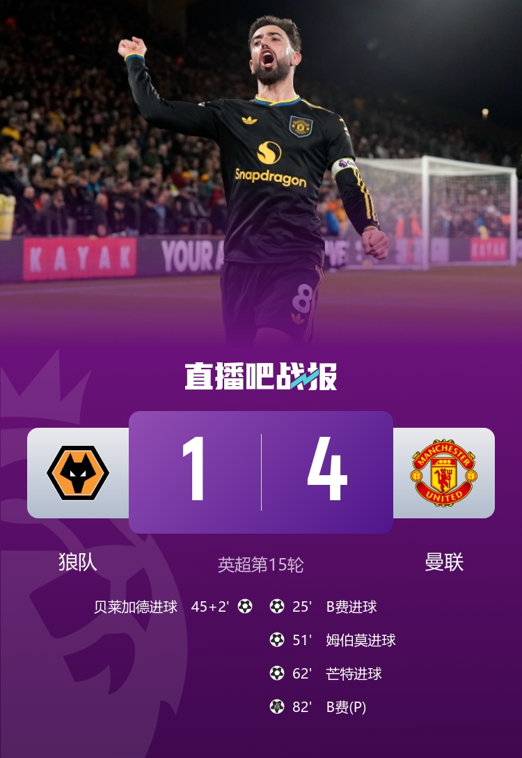 【比赛战报】 3轮不败升第6!曼联4-1狼队 B费2射1传姆伯莫芒特破门狼队15轮0胜
