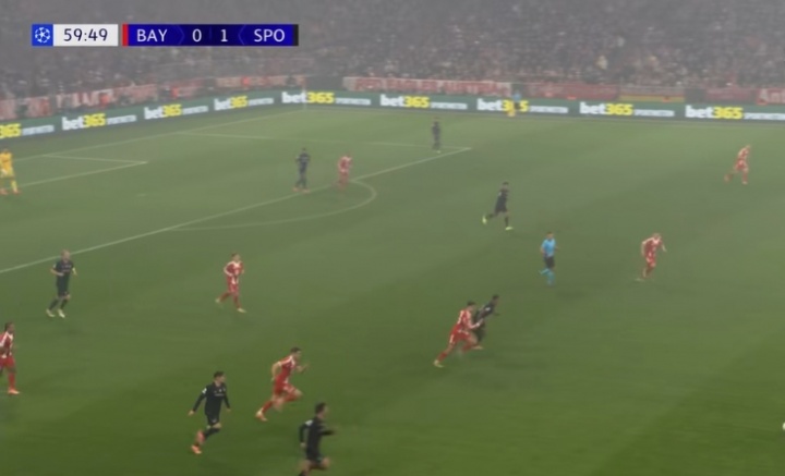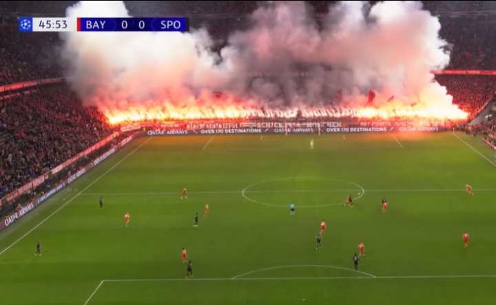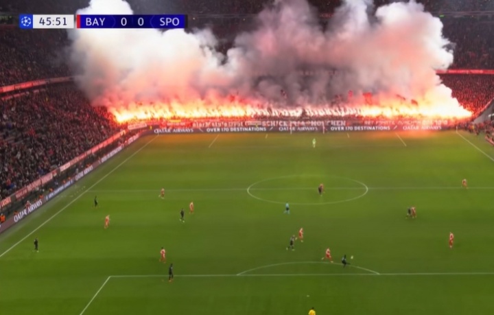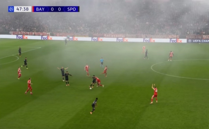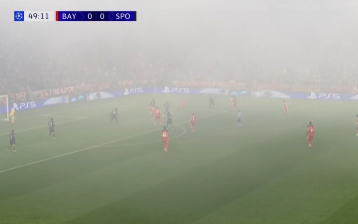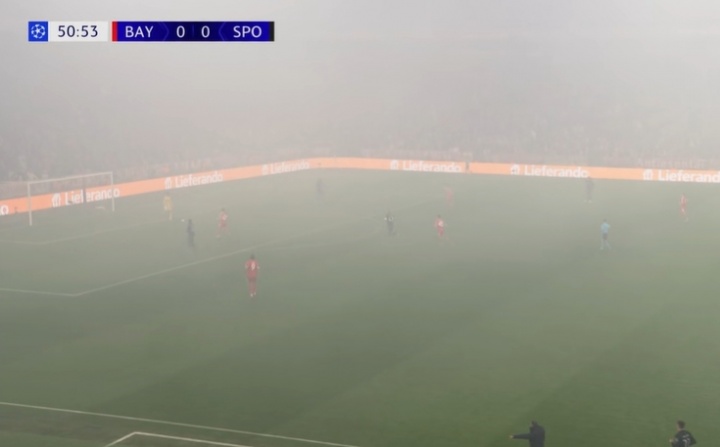 足球比分网12月10日讯 欧冠联赛阶段第6轮,拜仁3-1逆转葡萄牙体育。 本场比赛下半场因为拜仁看台球迷燃放烟花,从第47分钟开始,场内飘起烟雾,在之后十几分钟能见度极低,烟雾弥漫犹如仙境。这期间基米希还乌龙丢球,很可能就是受到烟雾影响。 第45分钟燃放烟花: