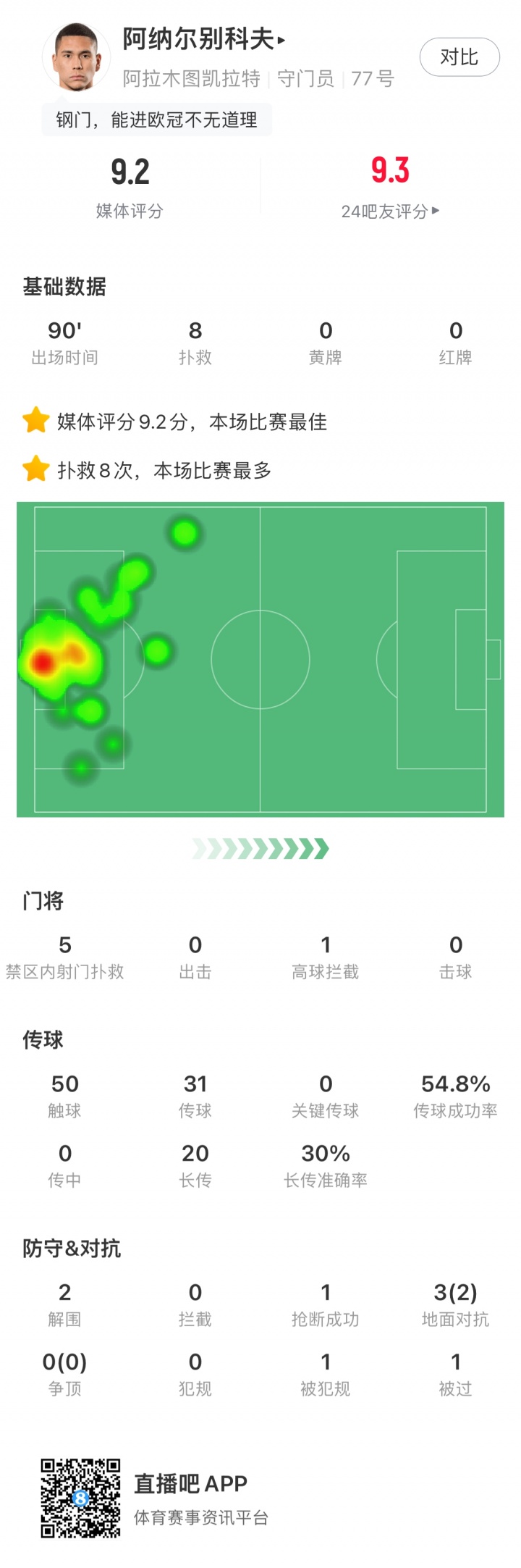 足球比分网12月10日讯 欧冠联赛阶段第6轮,阿拉木图凯拉特主场0-1不敌奥林匹亚科斯,哈萨克斯坦22岁门将泰米尔兰·阿纳尔别科夫单场做出8次扑救,避免一场惨败。 本场比赛奥林匹亚科斯全场20次射门,射正8次,3次击中门框,预期进球达到2.28。 泰米尔兰·阿纳尔别科夫做出8次扑救,其中5次禁区内扑救,得到全场最高分9.2分,获得全场最佳。