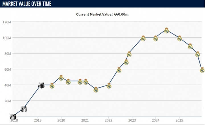 低迷…24岁罗德里戈身价4连跌一共掉了5000万,期
