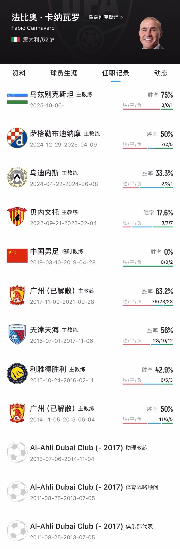 足球比分网12月11日讯 现乌兹别克斯坦主帅卡纳瓦罗接受《卫报》专访,谈到了职业生涯早期在中国执教的经历。 你最近成为乌兹别克斯坦国家队的主教练,这个机会是怎么出现的? 卡纳瓦罗:“我的执教生涯非常特别。有一天里皮给我打电话说:‘要不要来中国执教我的球队(广州恒大)?我想担任技术总监。’ “当时我在迪拜当助教,他(里皮)说服了我,我就去了。我告诉他:‘我们彼此都了解,你当技术总监,我来做教练。’ “然而三个月后,他和俱乐部发生争执离开了。俱乐部觉得我只是他的助手,把我也解雇了。当时我们联赛排名第一,还打进了亚冠联赛16强。后来那支球队赢得了联赛和亚冠冠军。可以想象我有多郁闷。 “之后我去了中甲,带队(天津天海)夺得冠军,然后又回到广州。三年后新冠疫情暴发,一切都变了。我回到意大利本以为能很快找到工作,但我的亚洲履历并没有得到认可。可能他们觉得这不是真正的执教经验。” 卡纳瓦罗于2014年11月首次担任广州恒大主帅,里皮则在当时转任技术总监。2015年2月里皮离任,6月卡纳瓦罗也随之卸任,斯科拉里接任帅位。 【完整采访戳>>】