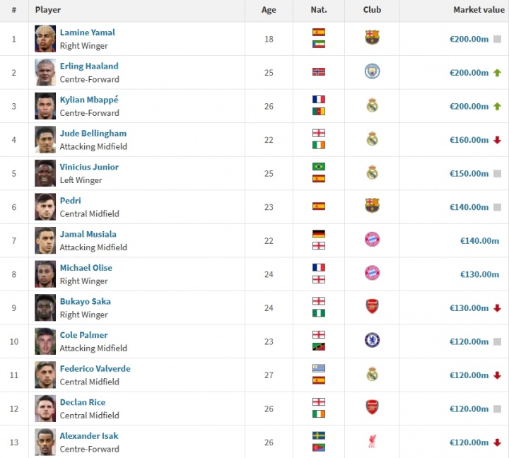 足球比分网12月12日讯 德转今日更新西甲身价,姆巴佩上涨至2亿欧,与亚马尔和哈兰德并列全球身价第一。 最新全球身价前十: 1、亚马尔 2亿欧 哈兰德 2亿欧 姆巴佩 2亿欧 4、贝林厄姆 1.6亿欧 5、维尼修斯 1.5亿欧 6、佩德里 1.4亿欧 穆西亚拉 1.4亿欧 8、奥利塞 1.3亿欧 萨卡 1.3亿欧 10、帕尔默 1.2亿欧 巴尔韦德 1.2亿欧 赖斯 1.2亿欧 伊萨克 1.2亿欧