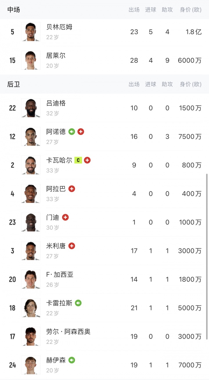 足球比分网12月12日讯 德转今日更新西甲联赛身价,预计皇马球员的身价会迎来一波下跌。 10月2日上一期德转更新时的皇马身价变化 【身价上涨】 赫伊森:6000万欧→7000万欧 居莱尔:4500万欧→6000万欧 卡雷拉斯:3500万欧→5000万欧 马斯坦托诺:3000万欧→5000万欧 贡萨洛·加西亚:800万欧→1500万欧 【身价下跌】 维尼修斯:1.7亿欧→1.5亿欧 罗德里戈:9000万欧→8000万欧 卡马文加:6000万欧→5000万欧 劳尔·阿森西奥:4000万欧→3000万欧 吕迪格:2000万欧→1500万欧 费兰·门迪:1400万欧→1000万欧 塞巴略斯:1000万欧→800万欧 阿拉巴:600万欧→400万欧 【身价不变】 姆巴佩:1.8亿欧 贝林厄姆:1.8亿欧 巴尔韦德:1.3亿欧 阿诺德:7500万欧 琼阿梅尼:7500万欧 迪亚斯:4000万欧 恩德里克:3500万欧 米利唐:3000万欧 库尔图瓦:2000万欧 弗兰·加西亚:1800万欧 卢宁:1800万欧 卡瓦哈尔:800万欧